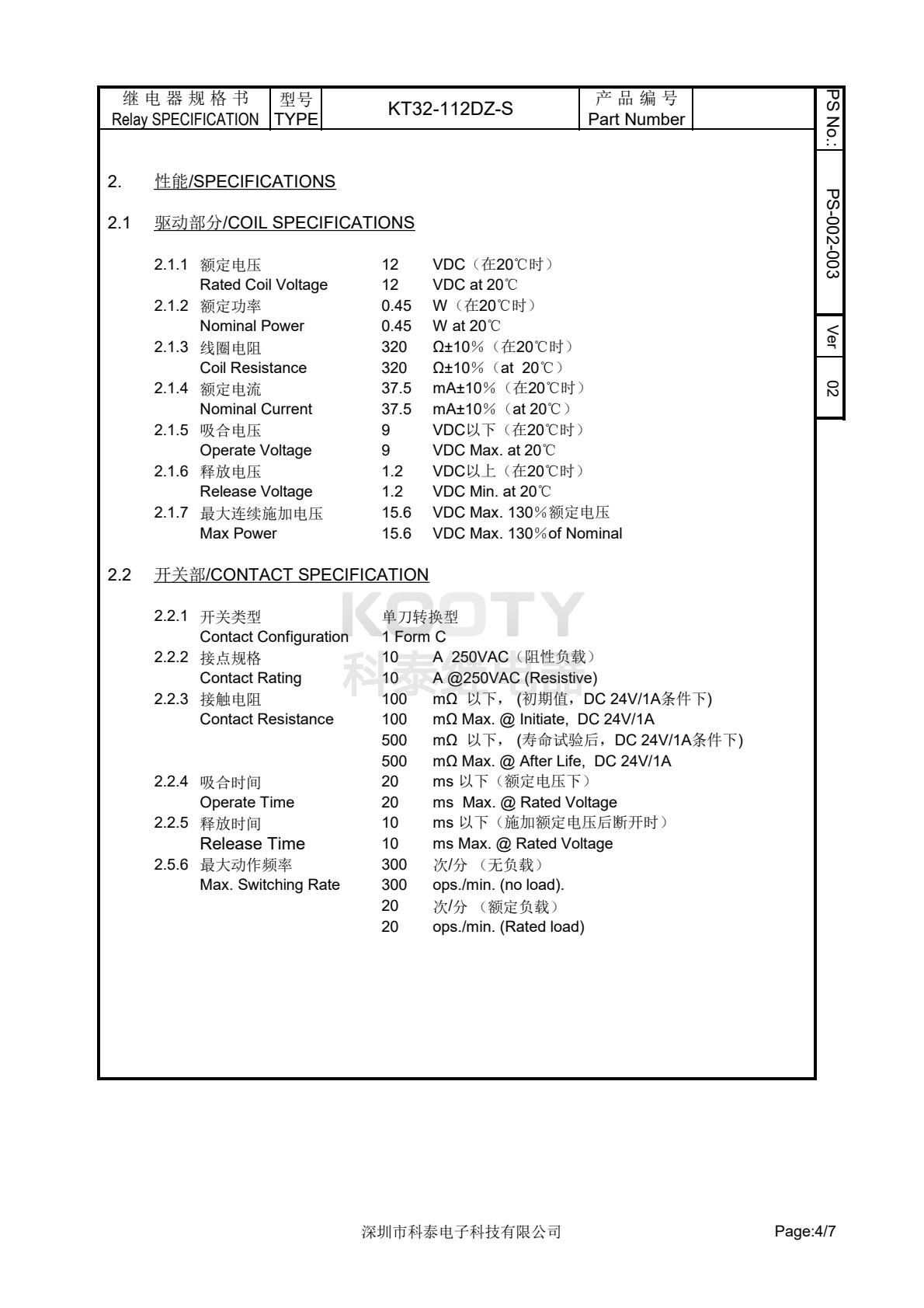 线圈参数:12VDC/0.45W,电阻 320Ω±10%