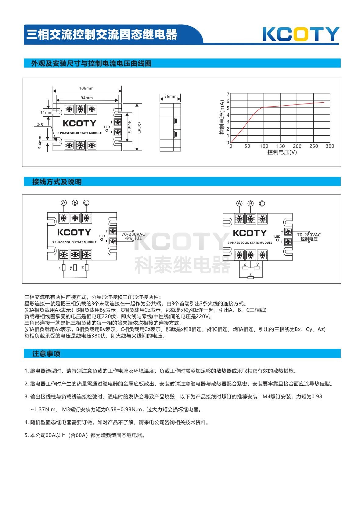 输入参数:控制电压范围 70-280VAC,控制电流≤10mA(最小 5mA),确保接通电压 90VAC,关断电压 50VAC