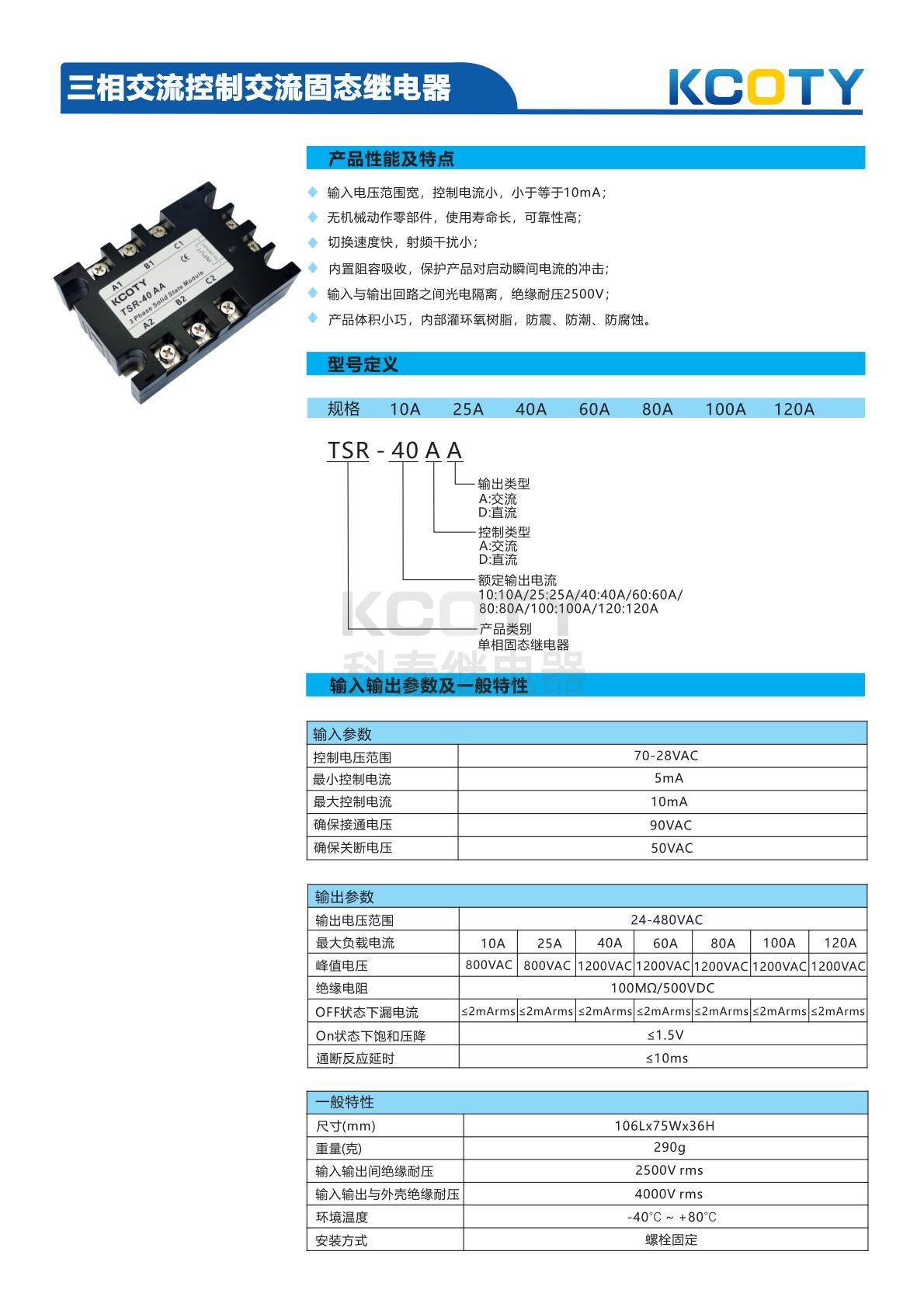 输出参数:输出电压 24-480VAC,最大负载电流 40A,峰值电压 1200VAC,OFF 状态漏电流≤2mArms,ON 状态饱和压降≤1.5V,通断延时≤10ms