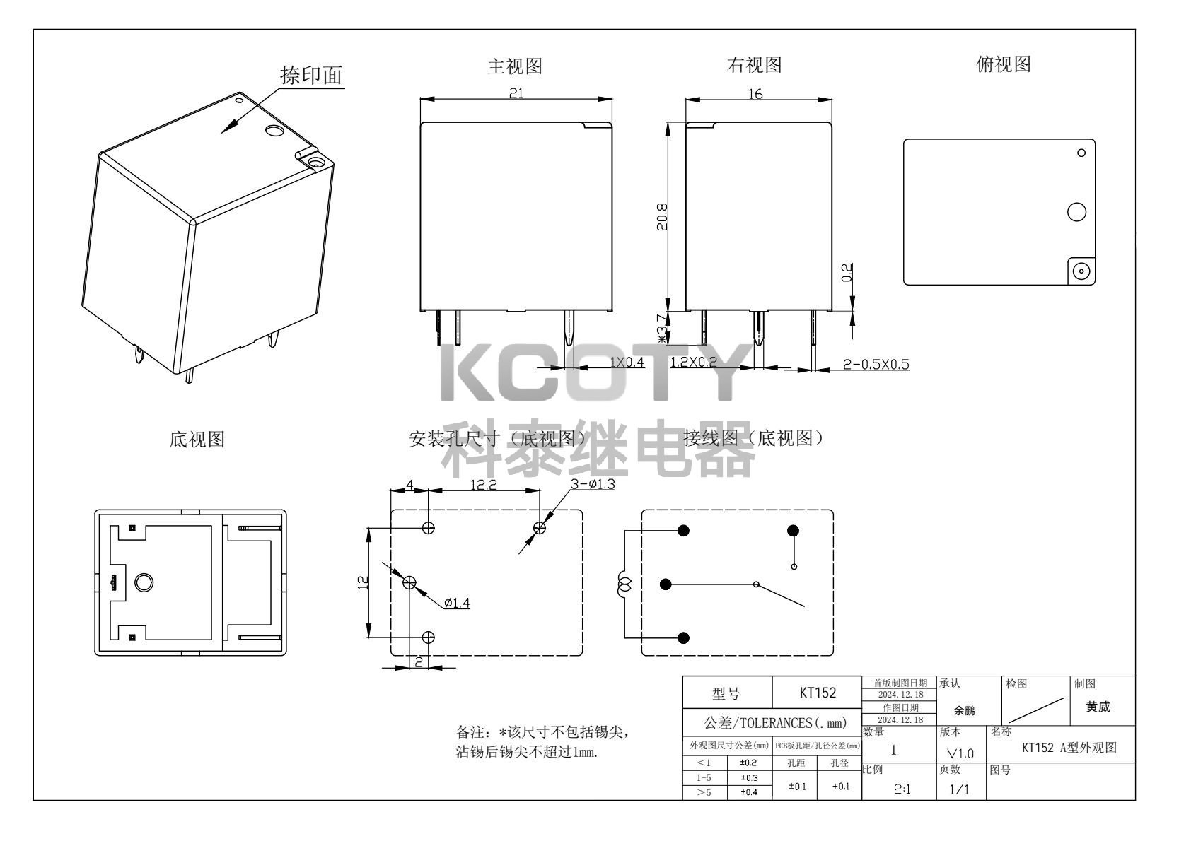 线圈参数:24VDC/0.36W,线圈电阻 1600Ω±10%,额定电流 15mA±10%