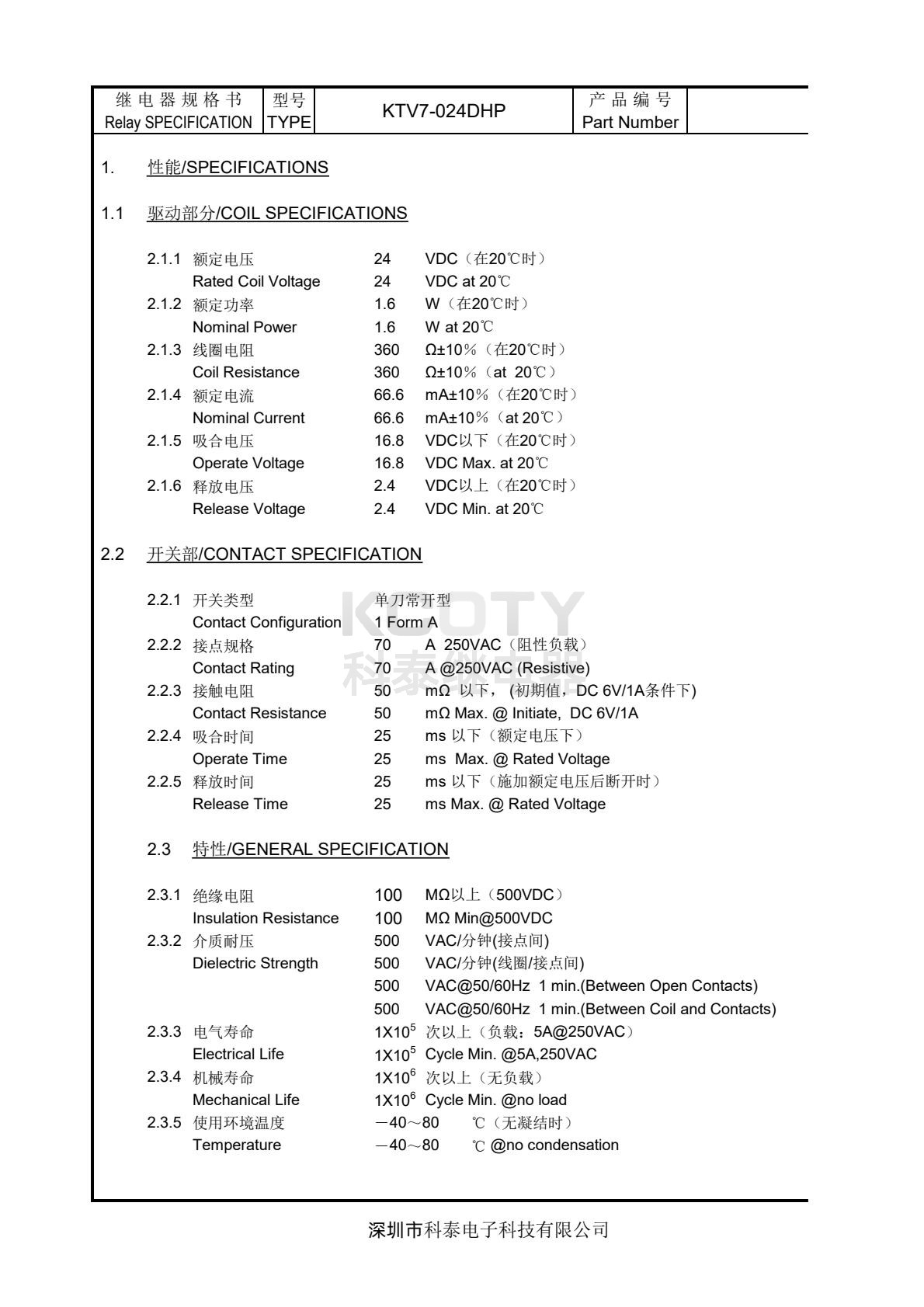 24VDC/1.6W,线圈电阻 360Ω±10%,额定电流 66.6mA±10%